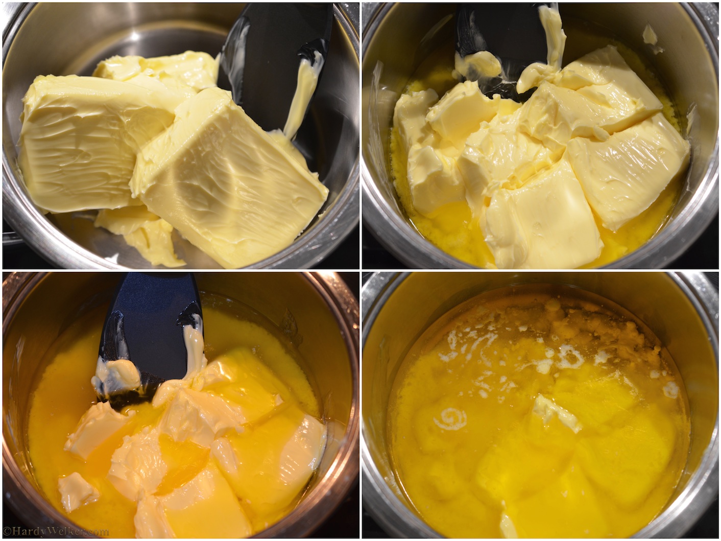 Die Butter wird kleingeschnitten (wenn sie kalt ist) oder auch komplett (wenn sie warm ist wie in den Fotos) in den Topf gegeben. Bei geringer bis mittlerer Hitze wird die Butter nun vorsichtig geschmolzen. Die Butter soll nicht kochen weil hierbei zum einen die Eiweise anfangen zu gerinnen, aber auch die Butter braun wird.